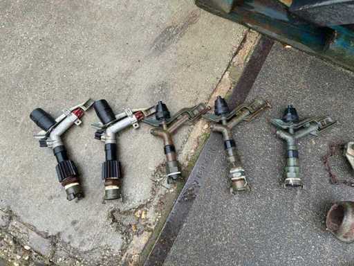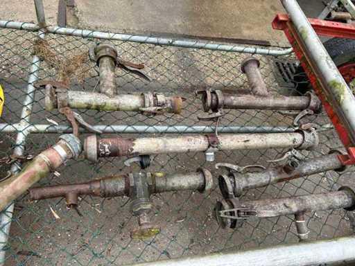 Equipped with. Irrigation pipes set on wagon Grey pipes (alu) pipes Pipes with blind plug (for mounting nozzle) Expired Brown tubes (steel) Pipes with blind plug (for mounting nozzle 5 Sprinklers 2x eskimo 3xparrot 3 T-pieces quick coupler 2 T-pieces with weld sock 2 tap 1 intermediate tube 4 Hoses (with piece of pipe)