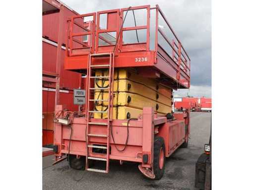 Internal No. 3236, Liftlux, platform length extended 9.60 m, ground clearance 0.15 m, lifting capacity on extension 500 kg, height transport position without railing 3.20 m, all-wheel drive, outriggers, attachment points for restraint systems (PPE),