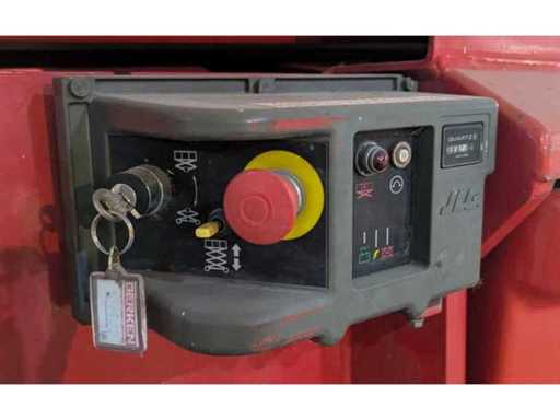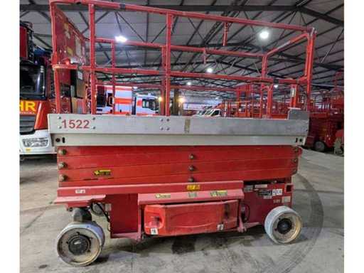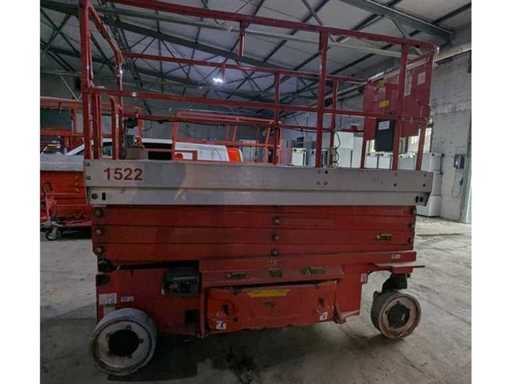 Internal No. 1522, ground clearance 0.13 m, lifting capacity on extension 120 kg, platform length extended 3.73 m, height transport position without railing 1.92 m, white tyres, attachment points for restraint systems (PPE) available. Note Batteries are missing, control panel is missing, wiring is partially dismantled,