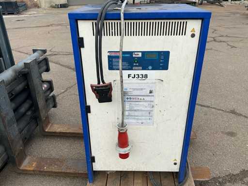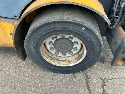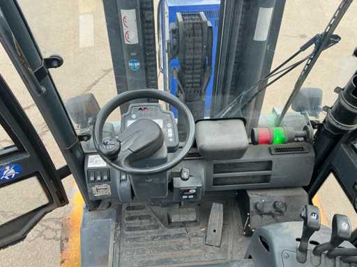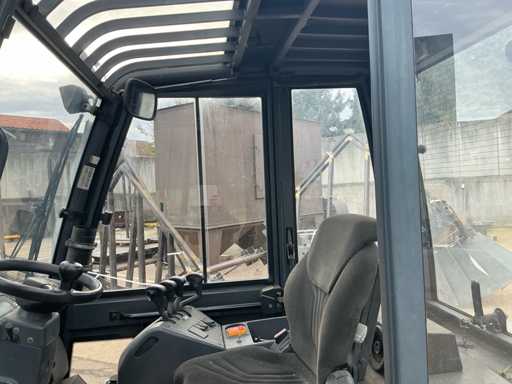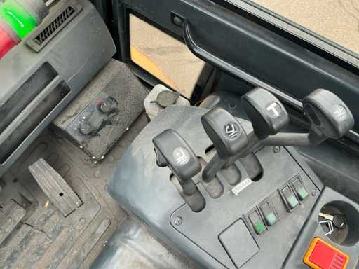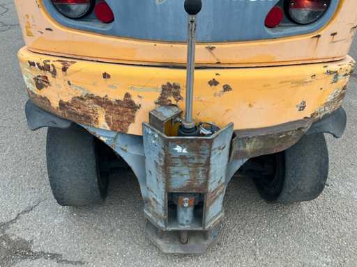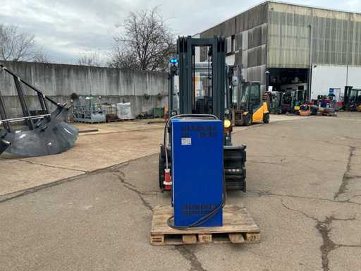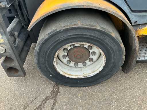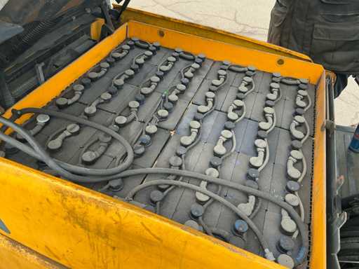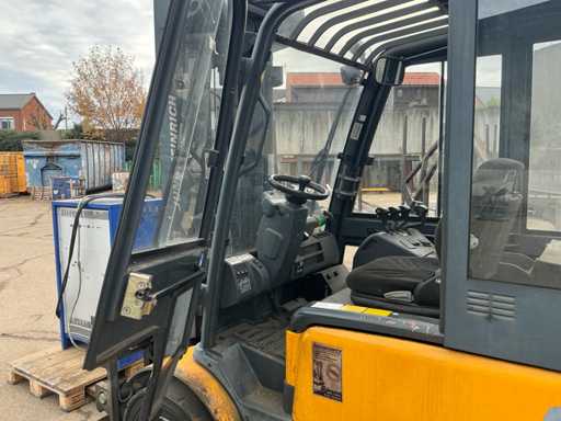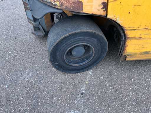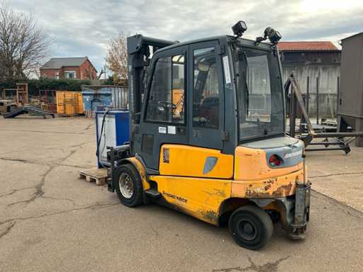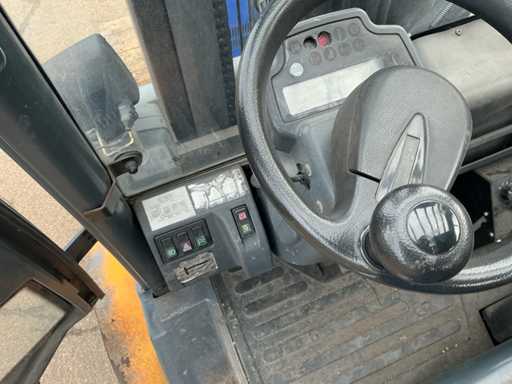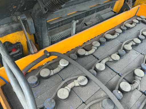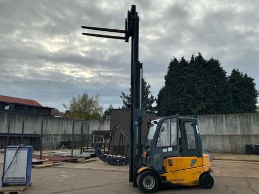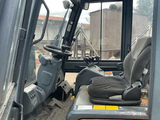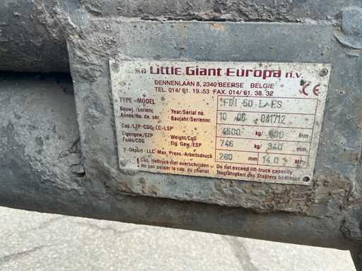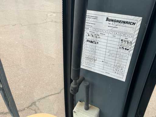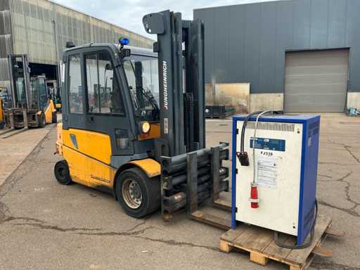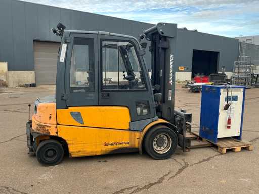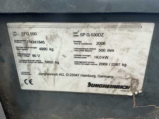 Jungheinrich EFG 550 electric forklift built in 2006, robust and powerful 5-tonne truck from the popular EFG series. Equipped with a fully enclosed cab with heating, large solid tires and a heavy lifting mast from Little Giant for intensive indoor and outdoor use. The machine shows visible signs of wear but is known for its reliability and strong build quality. Good battery with charger and equipped with safety lights when driving front and rear window.