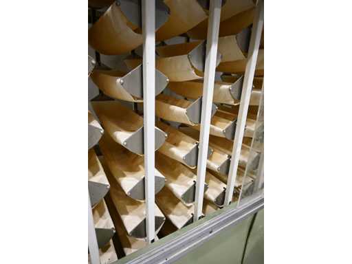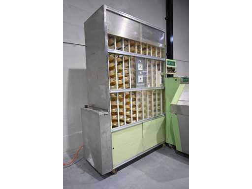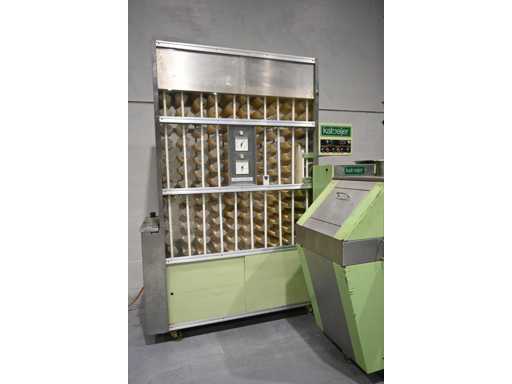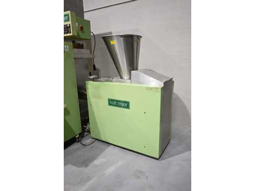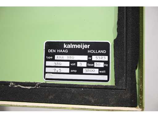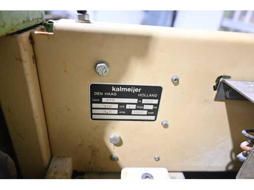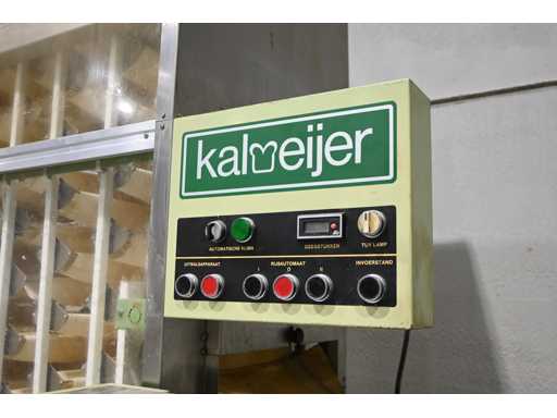 Consisting of: 1 x KRA 180 proofing cabinet, 1x Kalmeijer measuring and pointing machine, type KAG, size approx. 1600x600x1620 mm, weight 500 kg; 1x Kalmeijer folding and laying machine, type KTO, size approximately 1140x850x1580 mm; 380 Volts. The machine does not need to be dismantled to be moved outside. Entrance door is big enough.