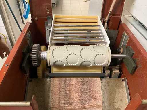 Machine is in working condition and is suitable for shaping biscuits or dough products. Equipped with conveyor belt and molding roller with different patterns. Ideal for bakery, catering or small-scale production. Machine is easy to operate and can be used immediately - including 10 forming rollers