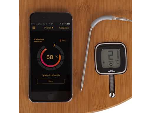The Patton Bluetotth Smart I thermometer connects to your smartphone or tablet via Bluetooth. Download the free app from the Appstore or Google Play Store and connect it to your Patton Bluetooth Smart Thermometer, after which you can monitor the temperature of your dish remotely.