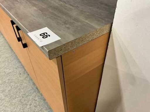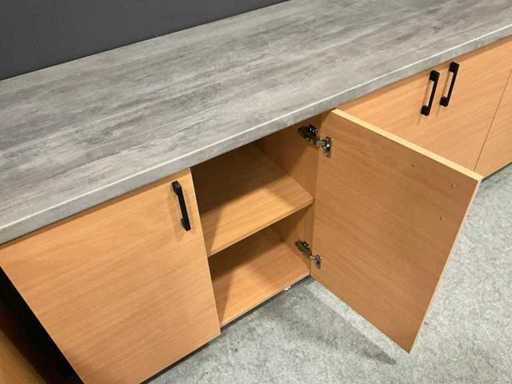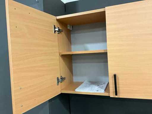 Equipped with 3 double wall cabinets and 3 double base cabinets.