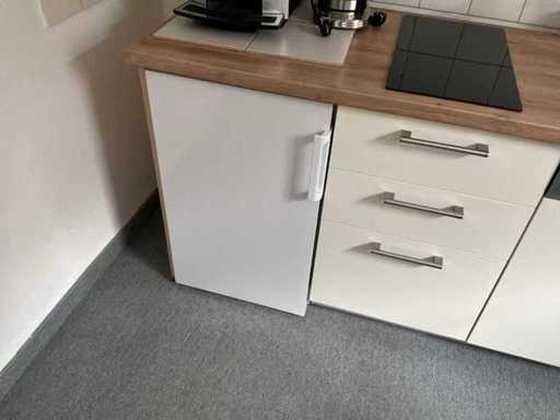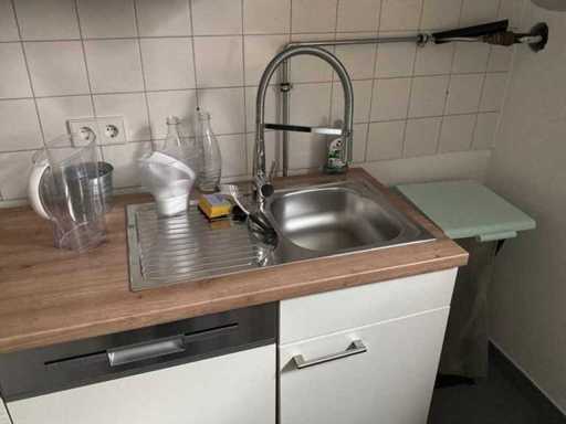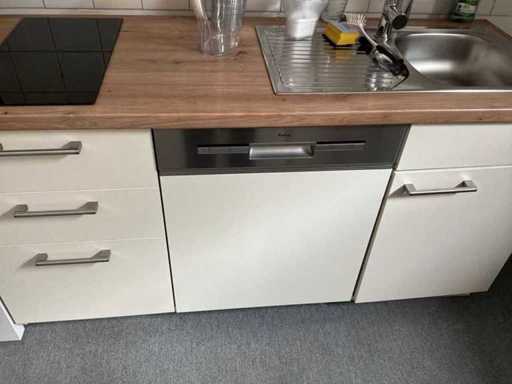 Front beige, stainless steel washbasin with fitting, 1 induction hob, 1 fridge, 1 dishwasher Fabr. AMICA
