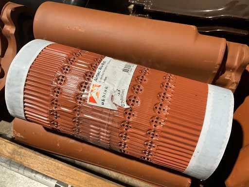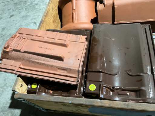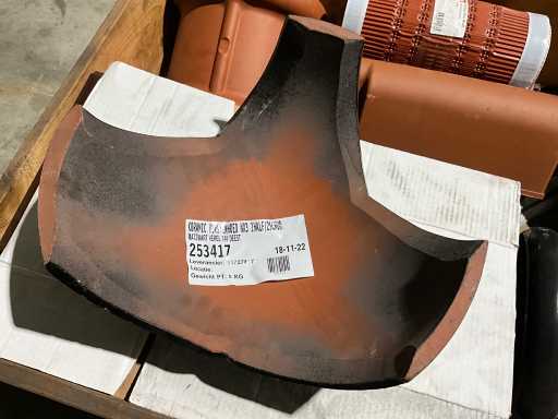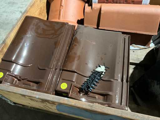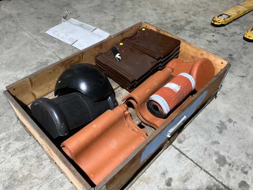 Various roof tiles; 9x brown lacquered pan; 4x red façade tile; red initial frost; black lacquered initial frost; black lacquered prince's hat; Ubbink Airtec Aluroll.
