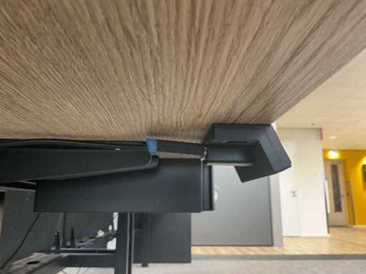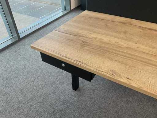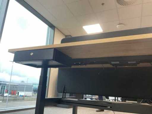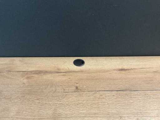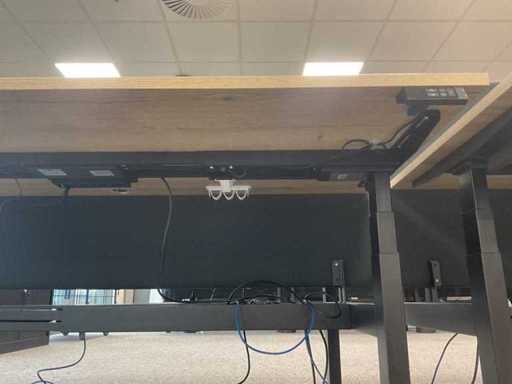 KTR desk type 180 EZS Duo with H-leg frame; Top melamine 25 mm thick; size: 180 x 80 cm; color Halifax Oak Frame color black; Electrically height adjustable from 65-130 cm by means of 2x2 motor; With memory display with cm indication; 2x USB 2.0 connection; soft start + stop; Fit app "stand Up Please" and cable duct with screen holders; The top is finished with PVC bumper.