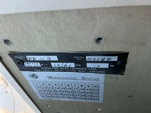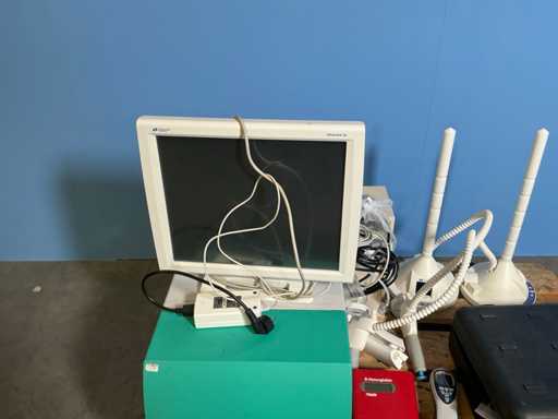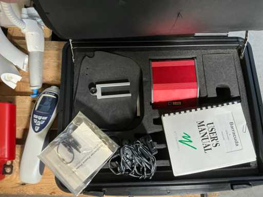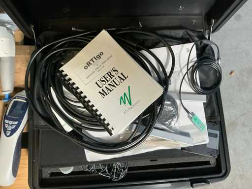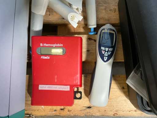 Different types including Hemocue hemoglobin meter, Q pod, E-Pod, Ortigo 2002 Barracuda in case with accessories and manual, Labsystem Fluoroscan Ascent FL, Zeiss Medilive camera control unit.