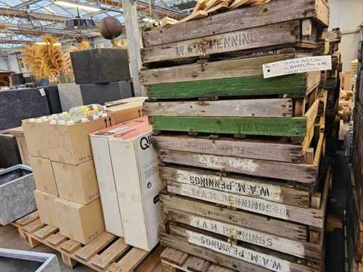 An impressive lot of about 100 authentic vintage wooden boxes will be auctioned. These boxes, formerly used in agriculture (e.g. for flower bulbs), captivate with their rustic charm and the characteristic imprints of well-known companies such as 'W.A.M. Pennings' and 'Van Egmond'. With their sturdy wooden frame and practical wire mesh floor, they are ideal for decorative purposes in the garden, as rustic shelf elements or for stylish storage. An absolute highlight for lovers of industrial and shabby chic style!