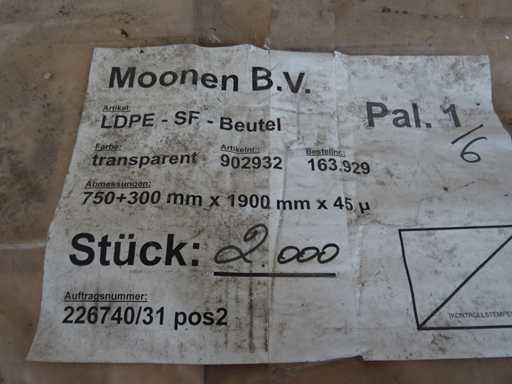 Article number: 902932, LDPE bag 750+300x1900mmx45ug, packed per 50 pieces per box (concerns 3 pallets)