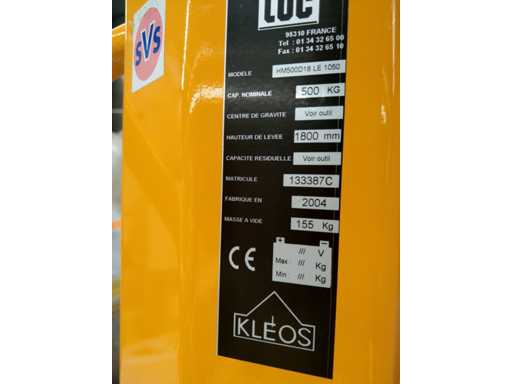 Year: 2004 Serial Number: 133387C Capacity: 500 kg Lift height: 1800 mm Empty weight: 155 kg CE compliant Ref. 4785