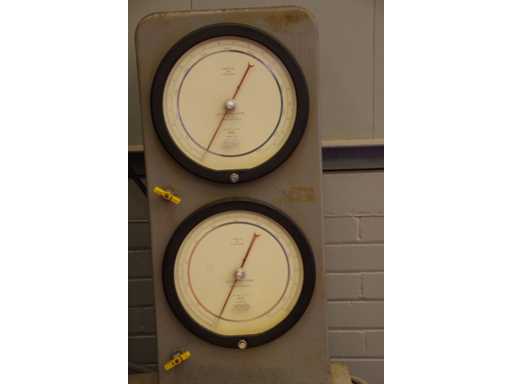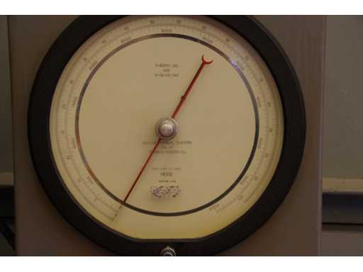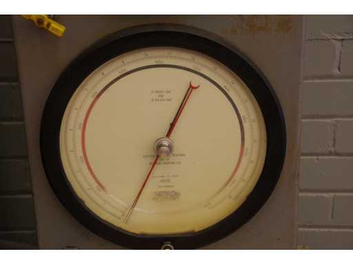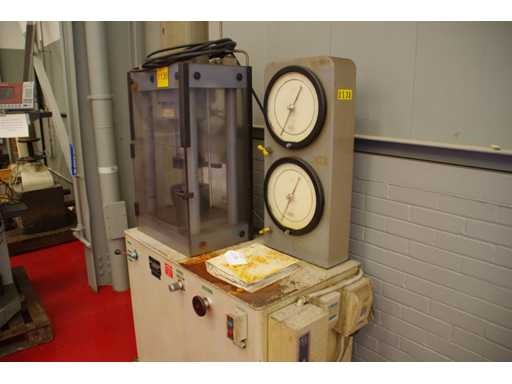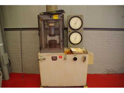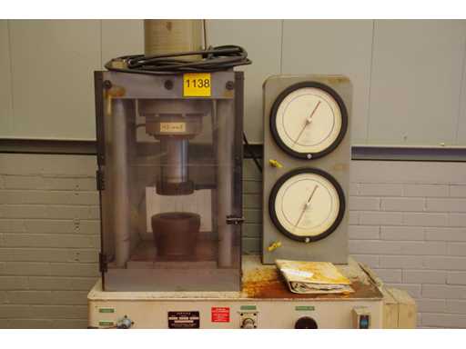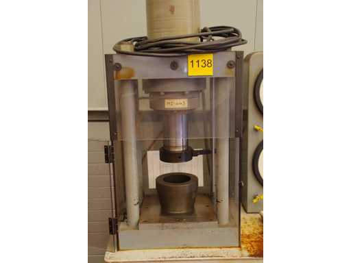 Serial number: 2066. Manual control lever Dual analog pressure gauges. Capacity: 60,000 lbs. Compression press manufactured by Louis Small. Designed for material strength testing or sample failure analysis in laboratory or quality control environments. Safety protection for the test area.