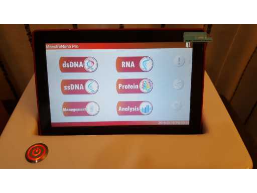 MaestroNano is a spectrophotometer intended solely for biochemical research. The primary function is the quantification of the microvolume concentration, for nucleic acid, including double-stranded nucleic acid (dsDNA), single-stranded nucleic acid (ssDNA), and ribonucleic acid (RNA) or protein solution.