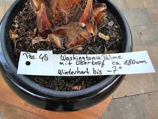 Bring a piece of holiday feeling directly into your garden or terrace with this magnificent Washingtonia palm tree. With an impressive total height of approx. 180 cm, this fan palm impresses with its strong, green fronds and robust growth. A special highlight of this offer is the elegant, shiny black planter, which perfectly showcases the palm tree. The plant is conditionally hardy down to approx. -7°C and is ideal as a solitary plant for sunny locations.