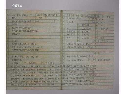 Serial number 9674, Registration date: 19.05.2016, KM: 632.202 km, Permissible gross vehicle weight: 20500 kg, Drive type: Diesel, Transmission type: Automatic, Engine power: 294 kW, Engine capacity: 12419 cc, Number of axles: 2, Wheel formula: 4x2, Cab: Long-haul, Colour: white