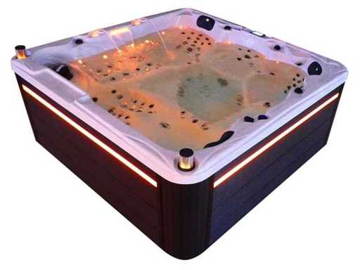 Control balboa (Balboa BP21 computer + latest Spa touch 3 display), Balboa heater (3000 watt), Balboa wifi (for remote control with the phone/tablet), Balboa bluetooth audio, 2 popup speakers with LED lighting, Subwoofer, plastic maintenance-free casing with LED lighting all around in the side panels, 4 massage pumps (3* 3hp, and 1* 400 watt air pump), 24h circulation pump (0.5hp), 3 seats and 2 berths (3 places with head cushion), thick (black) cover including, total 140 stainless steel stainless steel stainless steel jets of which 18 air jets with LED lighting (various sizes and different hydro jets), extra neck and foot massage jets, frost protection, Ozone disinfection system 50mg/h, various LEDs (43 pieces) lighting along the water's edge, aroma feeder, 2x pop-up water fountain with LED lighting, 1x large waterfall with LED lighting, various control knobs to control the force and distribution to the jets, 2x surface and cleaning filter, tub extra thick foam insulation (at least 45mm) + extra insulation on the outer walls with foil + 5mm thick insulation on the PVC closed bdem, water drainage, including steps, Aluminum frame (very strong and rust resistant) this spa is full of all possible orderable options, This is a new product in packaging. The spa can be connected to both 220 volts and 380 volts (35a or 49a).