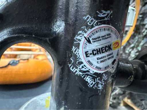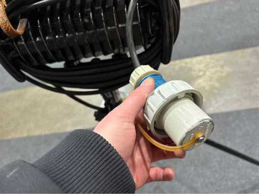 Double spotlight with 150 W / 110 V technology, E-Check tested (valid until 12/2027), including power cable with CEE plug. Lamp tested according to VDE, according to the badge by Elektro Steidl. Cable routing neatly wound, function given as specified.