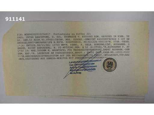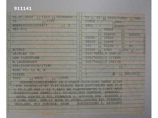 Internal number: 911141, KM: 458.211 km, Registration date: 25.07.2018, Drive type: Diesel, Transmission type: Automatic, Engine power: 310 kW, Displacement: 12.809 ccm, Number of axles: 3, Wheel formula: 6x2, Environmental sticker: 4 (green), Emission class: Euro VI, Cab: Long-haul, Colour: white, Permissible gross weight: 26.000 kg, Empty mass: 19.670 kg, Payload 6.330 kg