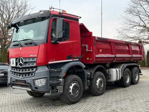 robust Mercedes Benz Arocs 4145 8x4 tipper with Meiller body and Bordmatic system. This powerful construction truck is equipped with an automatic transmission and a strong 331 kW engine, making it ideal for heavy construction transport, infrastructure and earthmoving.