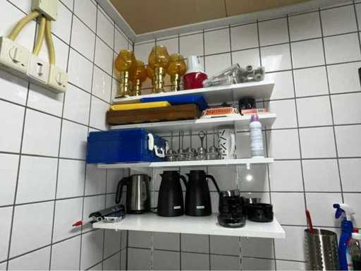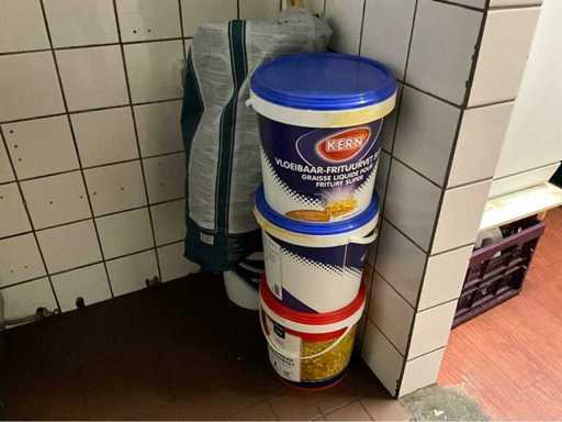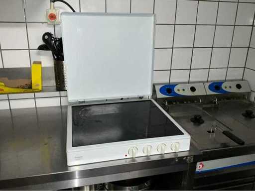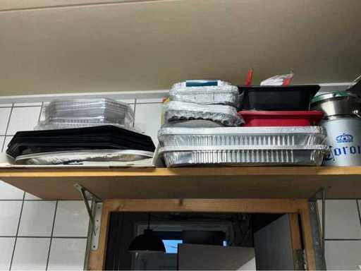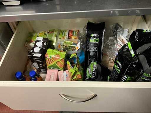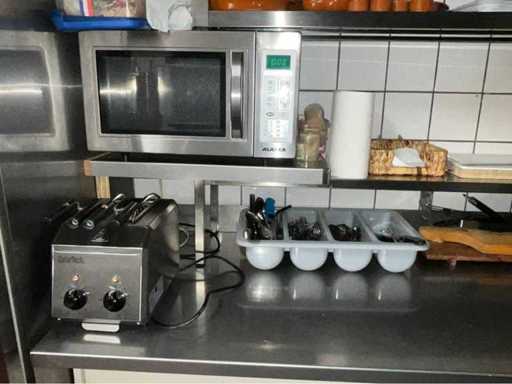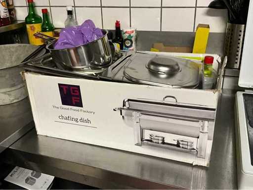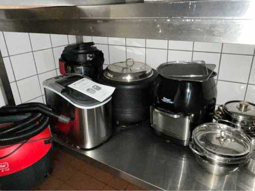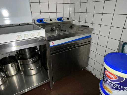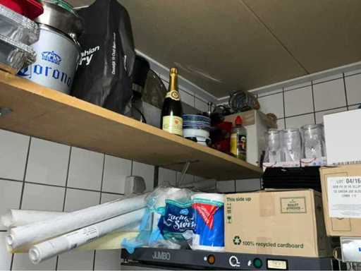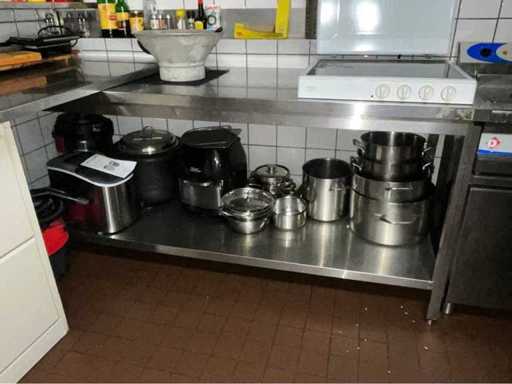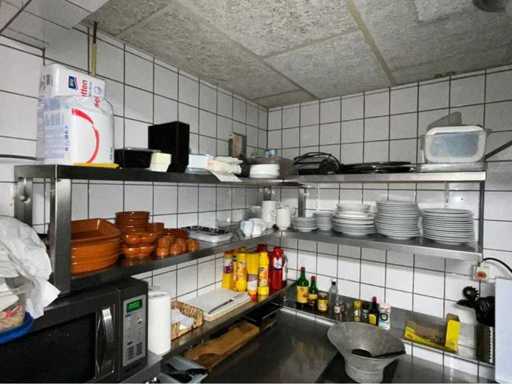 consisting of: 1x Diamond stainless steel double fryer with 2 door base cabinet including oil content; 1x Pelgrim ceramic hob table model; 1x Gaggenau stainless steel extractor hood; 1x Alaska microwave; 1x Caterchef sandwich maker; corner shelving rack; 1x stainless steel work table with bottom shelf; 1x stainless steel, worktop; various porcelain and cutlery; stainless steel pots; pans; cleaning products; glassware; trays / dishes; being the entire contents of the kitchen without dishwasher; without freezer; without refrigerator;