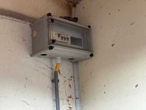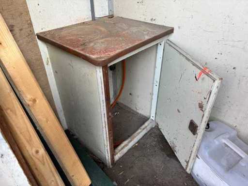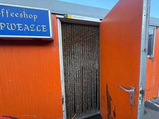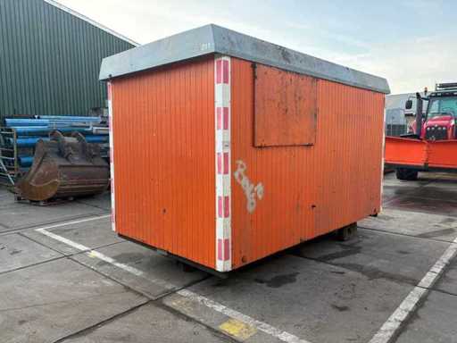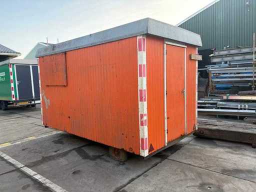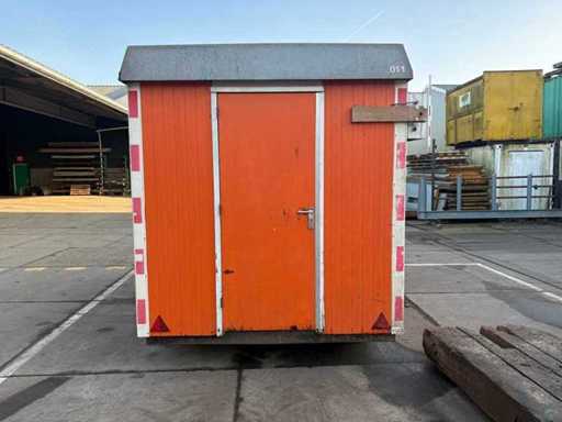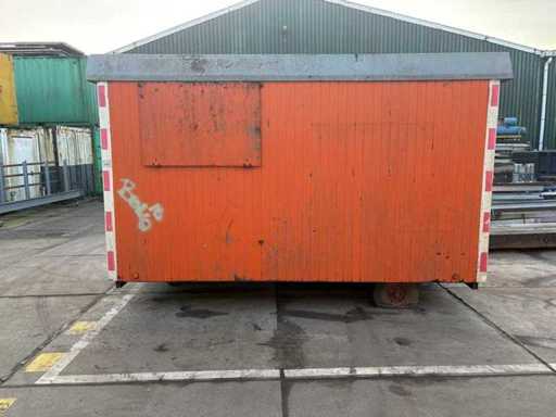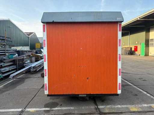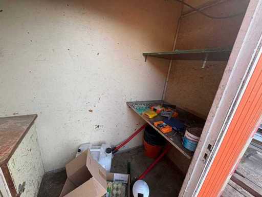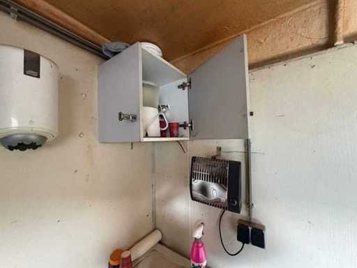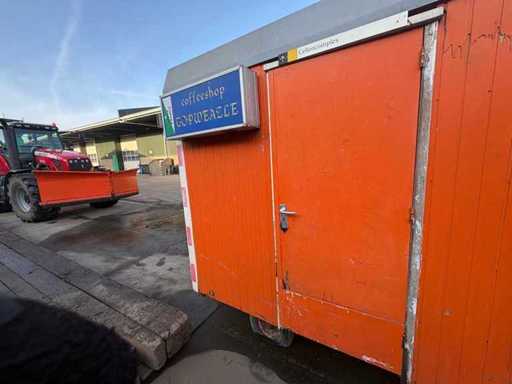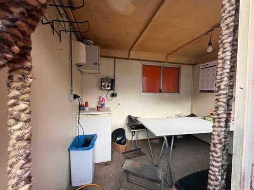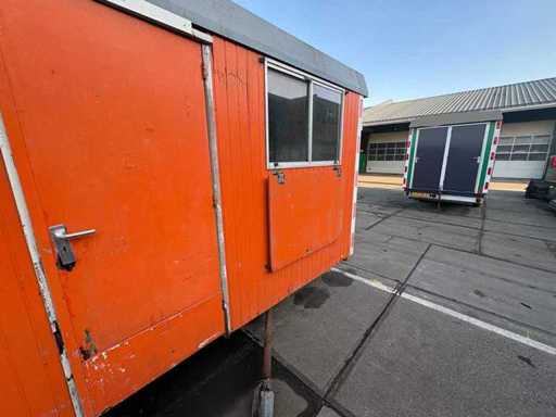 Sitting area with table and fixed benches; equipped with kitchen with sink; cabinets and boiler; separate storage room with worktop and shelves; equipped with electricity and group box; unit has clear signs of wear and wear; without a license plate; mobile on chassis with drawbar; tires are flat;