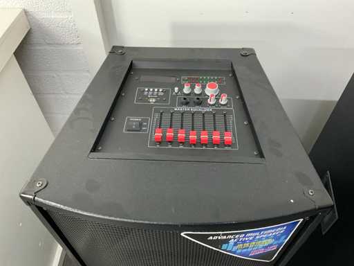 A speaker is daisy-chained with active speaker, USB, SD and FM radio, 15 inch speaker 2-way.