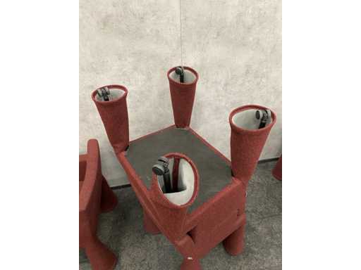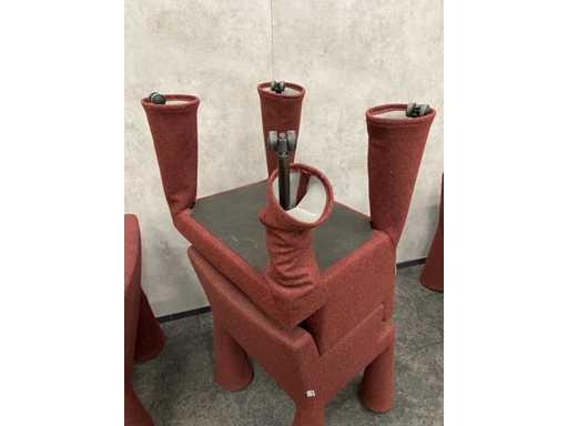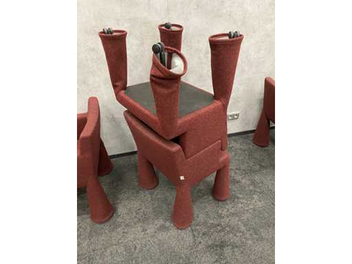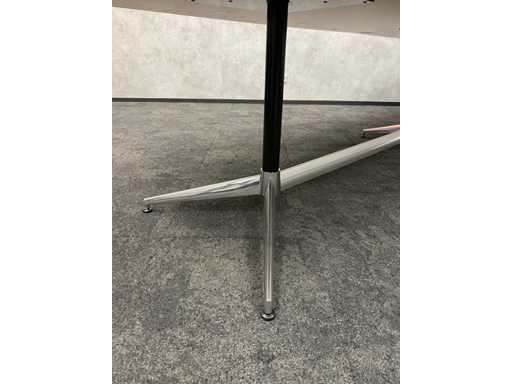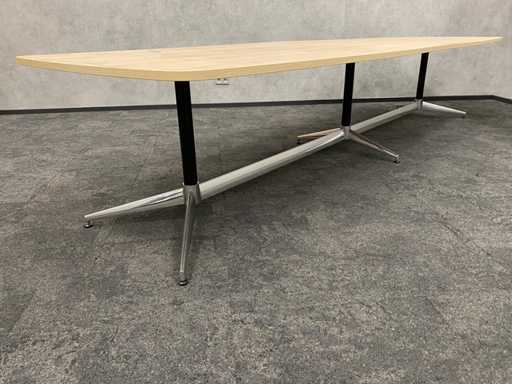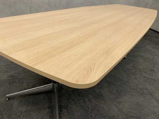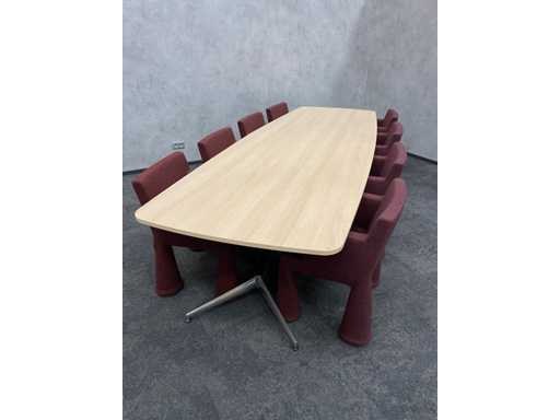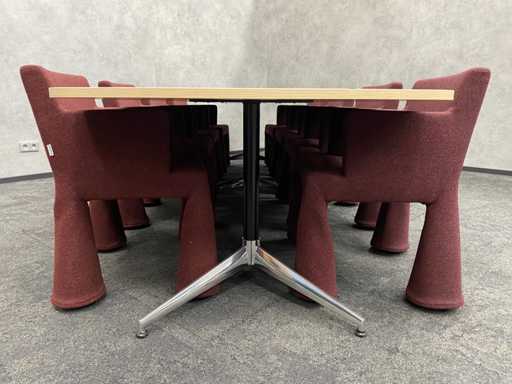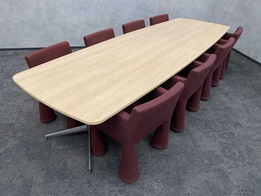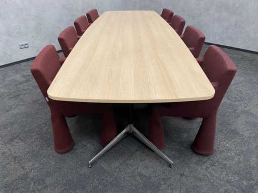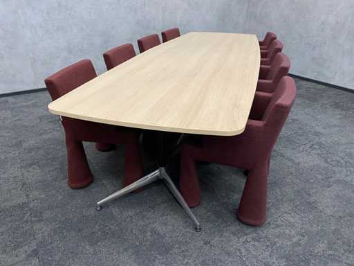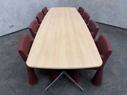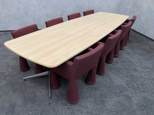 - 1x NEW table with new black/chrome steel design frame and new 2-piece oak melamine table top with furniture tensioners. Afm. approx. hxbxd 73x370x120 cm. Table has already been disassembled (top in 2 parts, frame in 4 boxes) ----- 8x Moooi VIP mobile design chair.