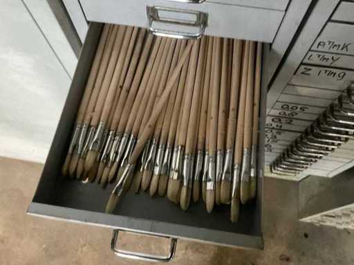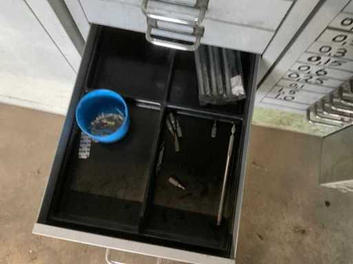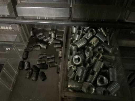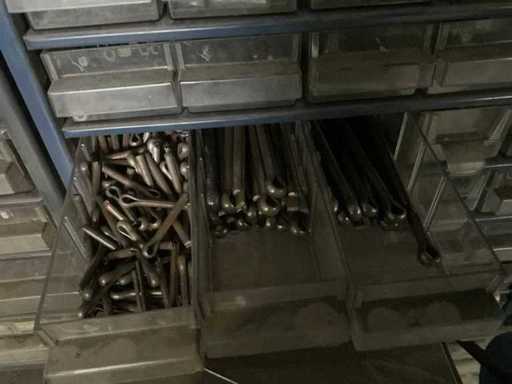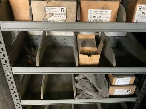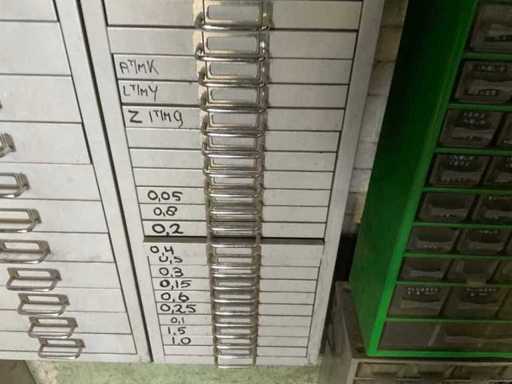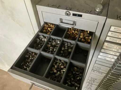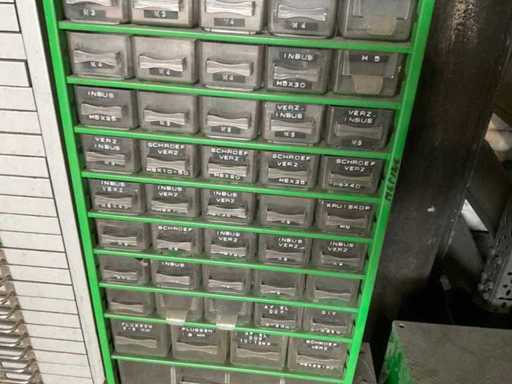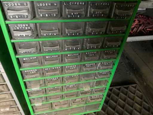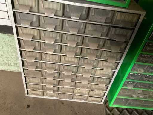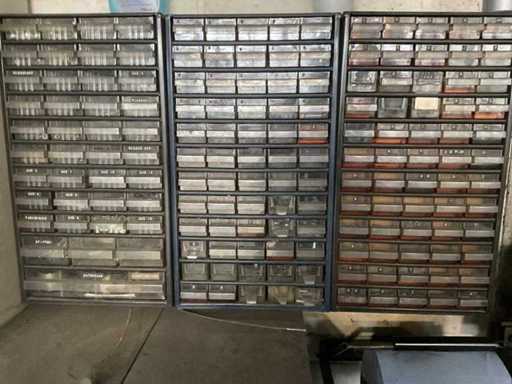 Various mounting materials in various storage cabinets, including screws, plugs, numbers/letters, etc.