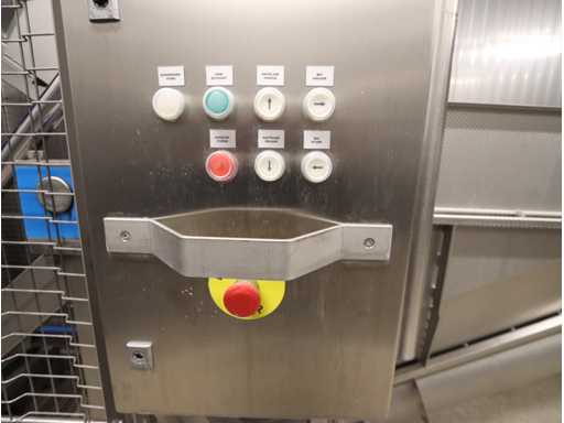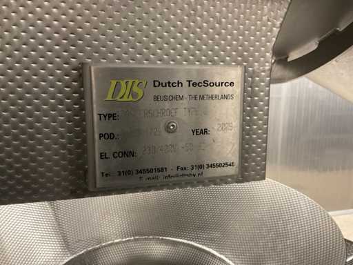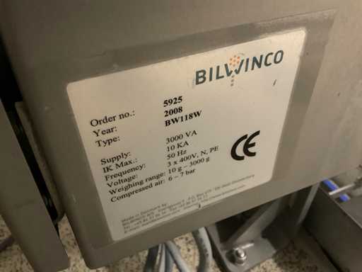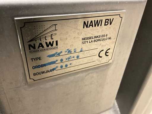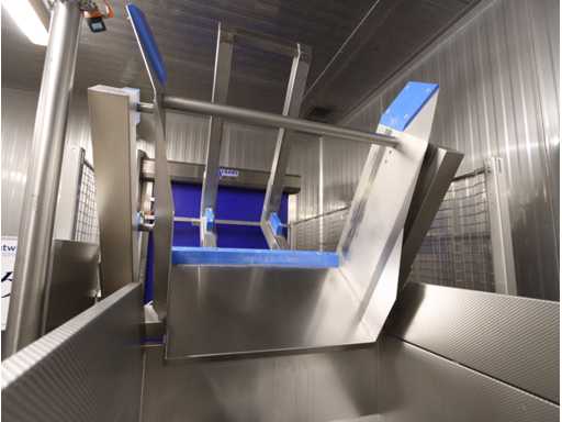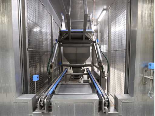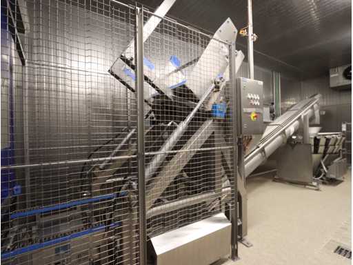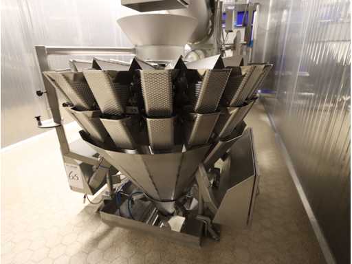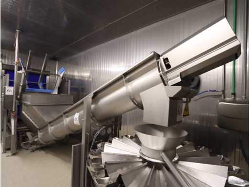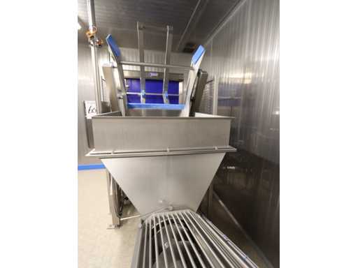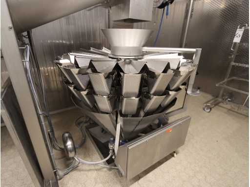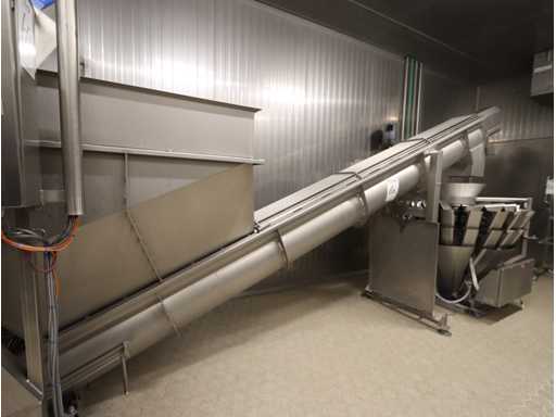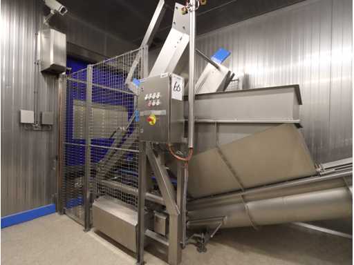 Consisting of: bucket tipper with feed chain conveyor, track width 850 mm, length 2000 mm, including elevator screw conveyor with receiving hopper, screw Ø 400 mm, screw length 4500 mm, output height 1500 mm, infeed opening bunker approx 1100x1300 mm, "Bilwinco" multihead weigher, type BW118W 18 heads, weighing range 10-3000 grams, including mobile rack with accessories, floor passage not included