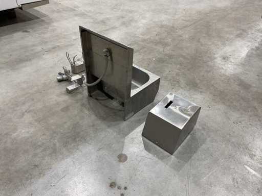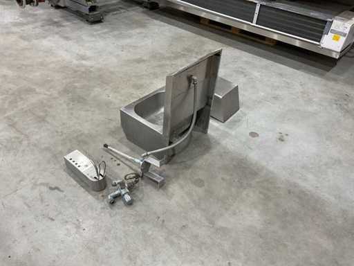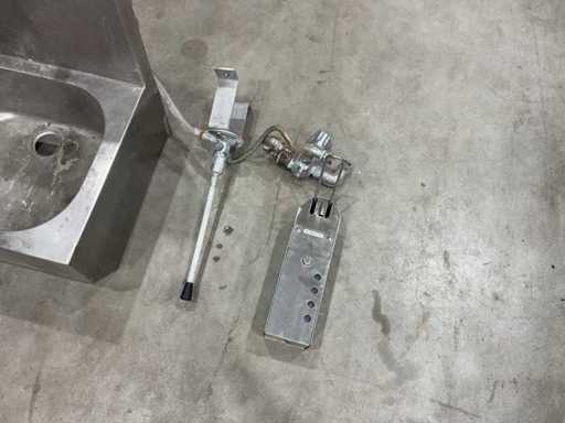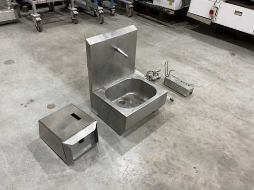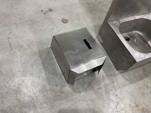 Stainless steel sink with knee-operated taps; paper roll holder; soap dispenser
