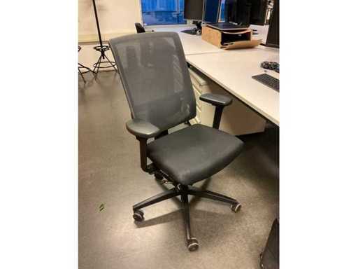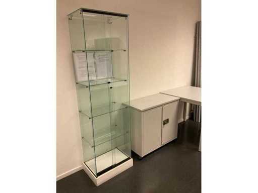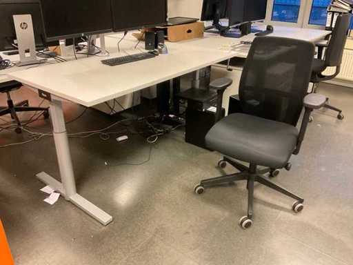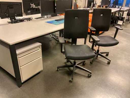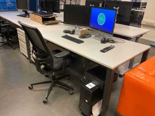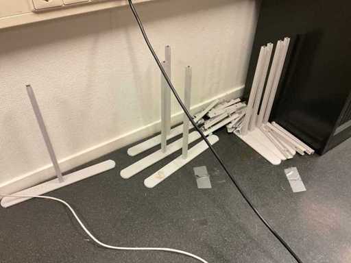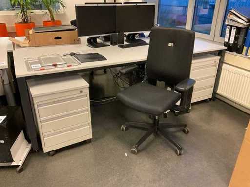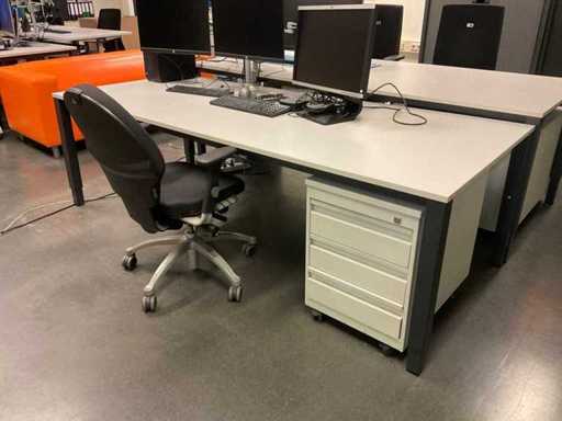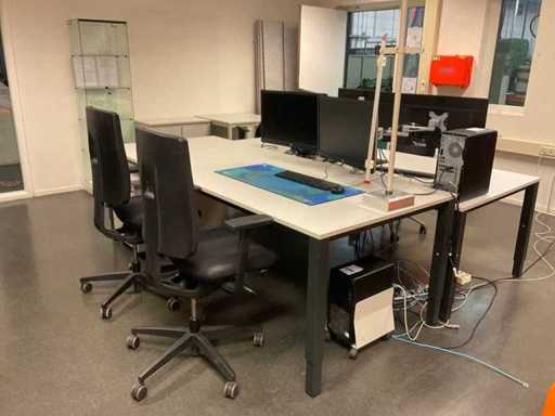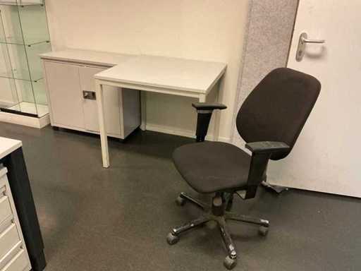 Lot consists of 6x desk 200x100cm and 240x100cm, various acoustic partition panels with supports, table dimensions approx. 80x80 cm, hinged door cabinet, 8x office chair, 6x drawer unit, trash cans, 2 coat racks and display cabinet
