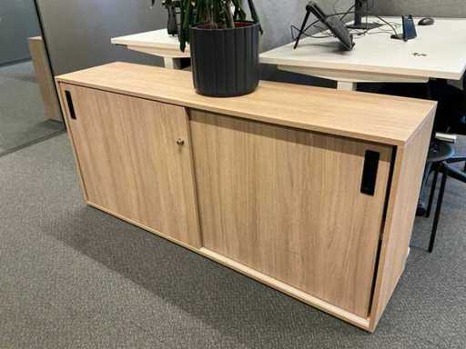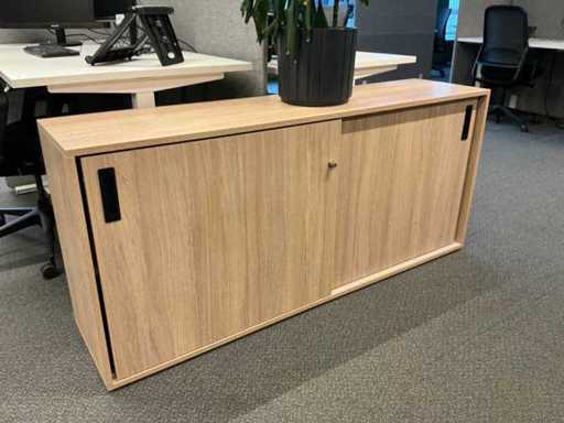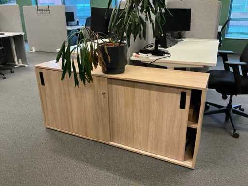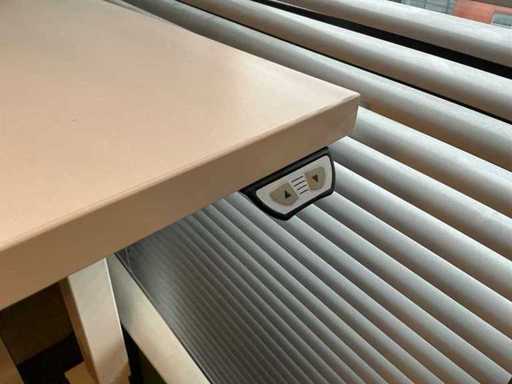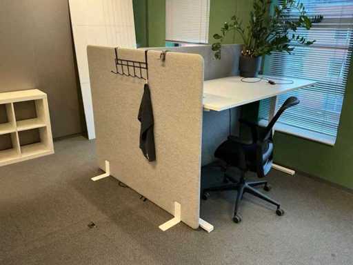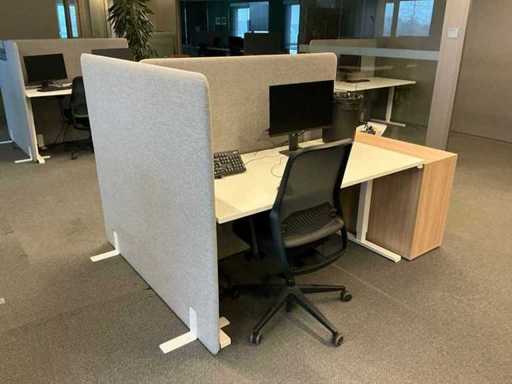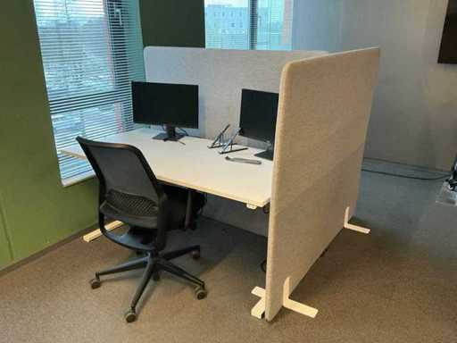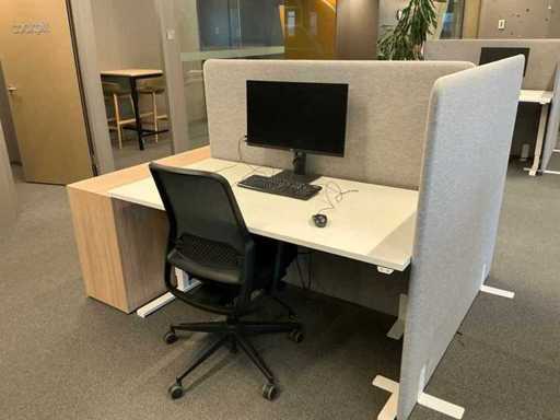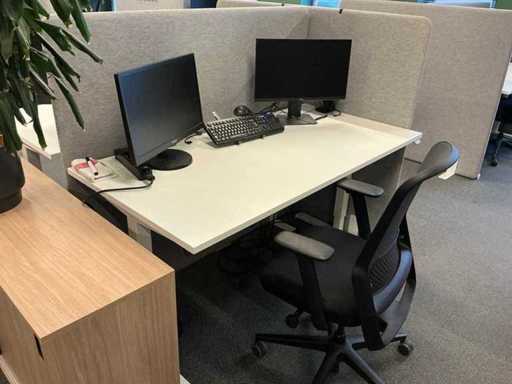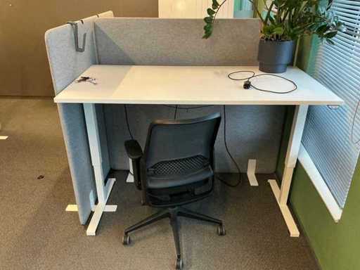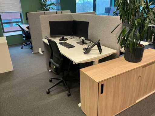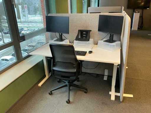 Lot consists of 12 electrically adjustable workstations; 12x Office table (160x80cm, max height 120cm), 12x Windhahn Office chair, 12x partition wall (covered with fabric, W160cm H140cm), 3x storage cabinet 164x40x74cm. Monitoring and ICT not included
