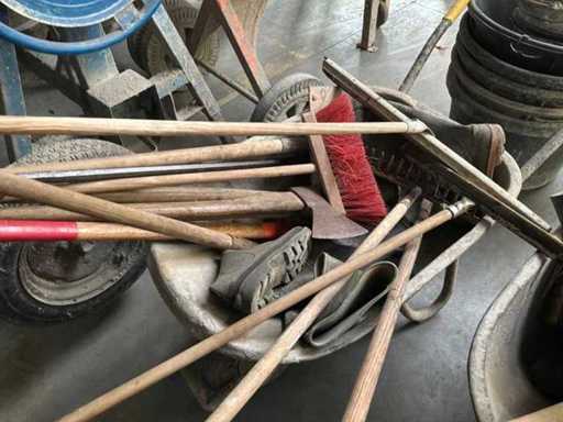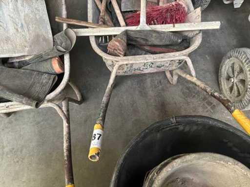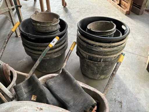 Including 2x wheelbarrow with batch of steel tools, rubber boots, approximately 10x mason's tub and various buckets.