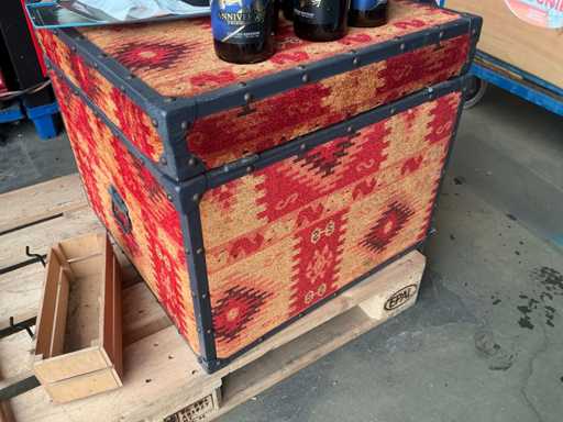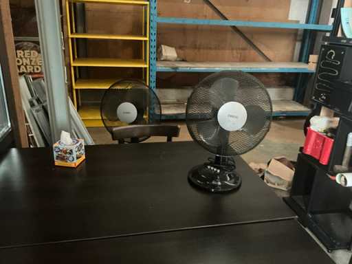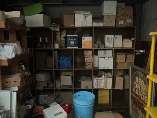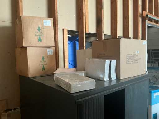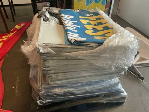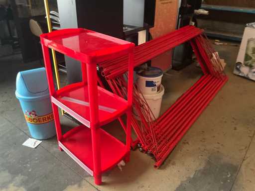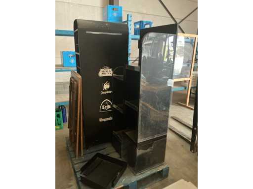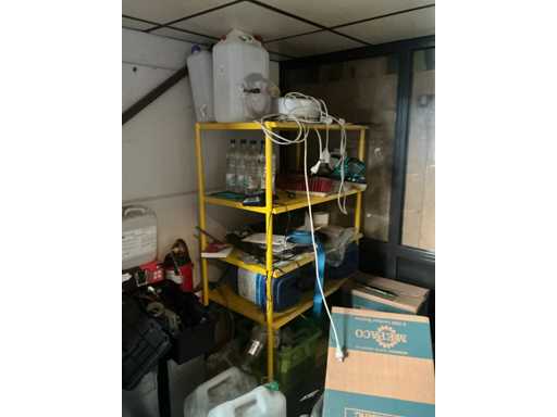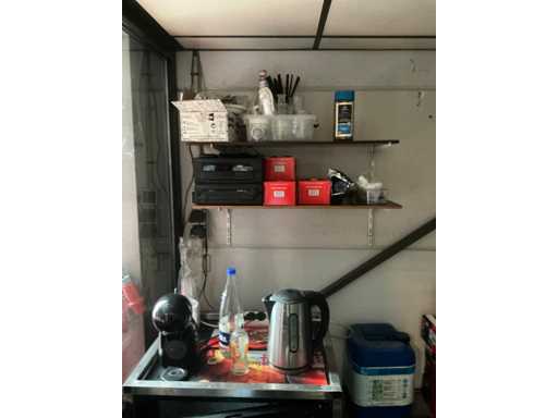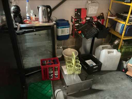Consisting of: batch of various promotional and advertising material, batch of various tables and chairs, batch of various glasses, refrigerator, 4 various coffee machines, mini hi-fi chain Kenwood, 2 various metal racks, wooden storage box, batch of various garden tools, 3 metal filing cabinets, disassembled presentation stands, various shelves, delivery according to instructions