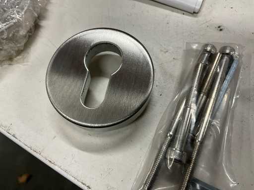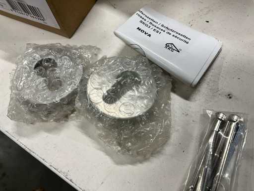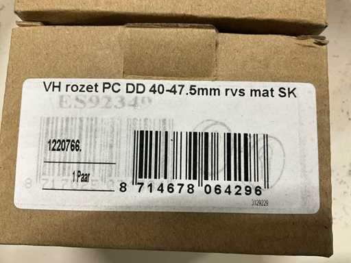 Unused new in packaging; Stainless steel AISI 304 (A2). Rosette size Ø 52x11.5 mm; Includes 2 sets of stainless steel screws M5x50 mm and M5x75 mm.