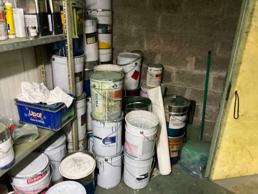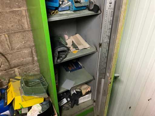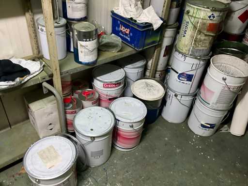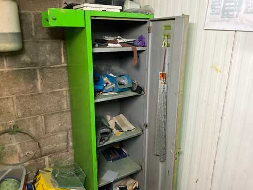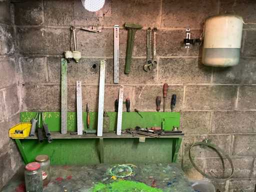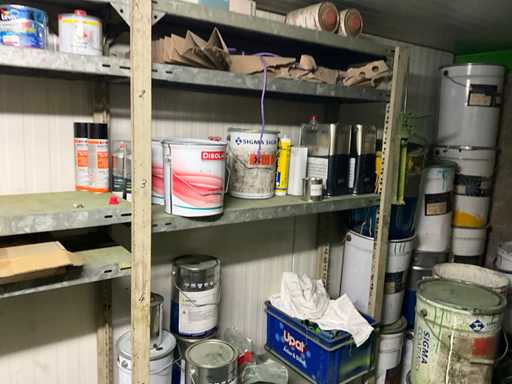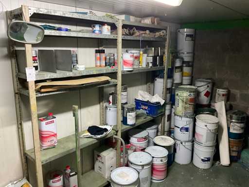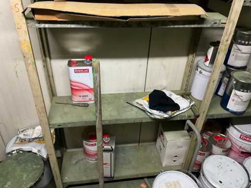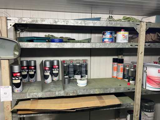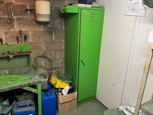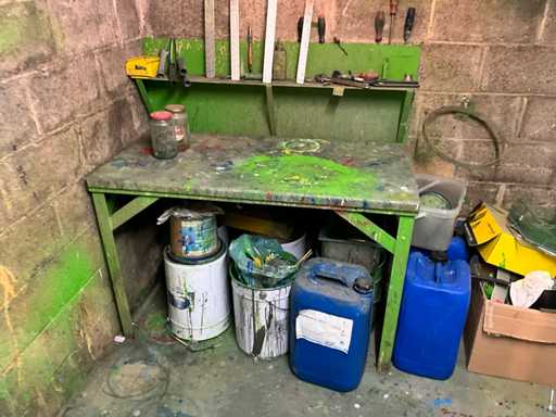 Consisting of workbench 120x65x80cm, locker cabinet 50x50x180cm, shelf rack 205x34x200cm, including contents including spray cans,