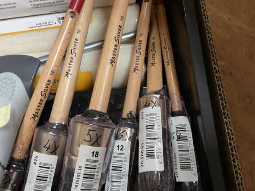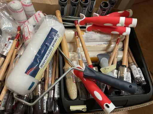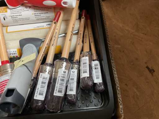 Spare roles; paint brushes; paint roller with bracket; Brackets; paint tray