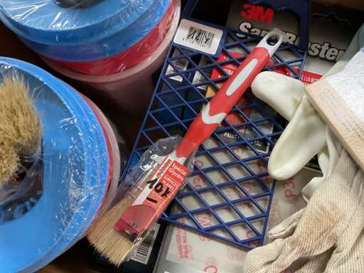 Masking tape; paint reservoir pot; painter's glove; sandpaper; Brushes
