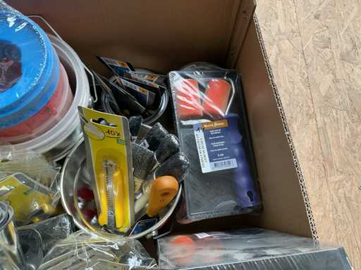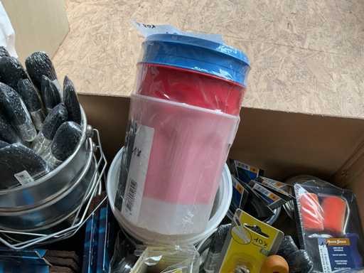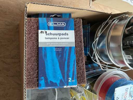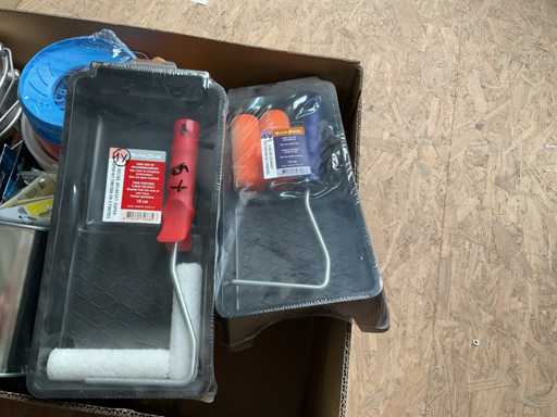 Paint pot; paintbrushes; cutting blades; putty knives; paint roller set; sanding pads