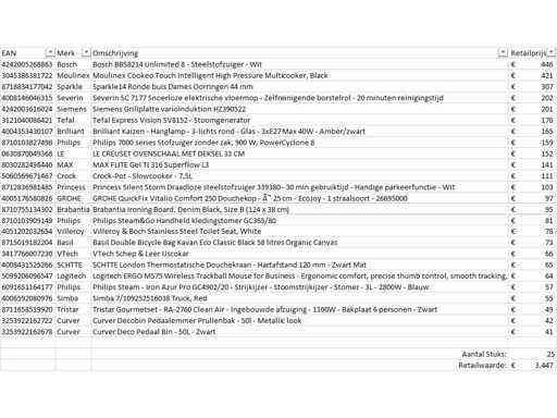 This concerns a batch of A-brand returned goods from a large online retailer. The batch consists of various product categories. Number of pieces: 25. Retail value: €3447,- Unchecked: operation unknown (mix of