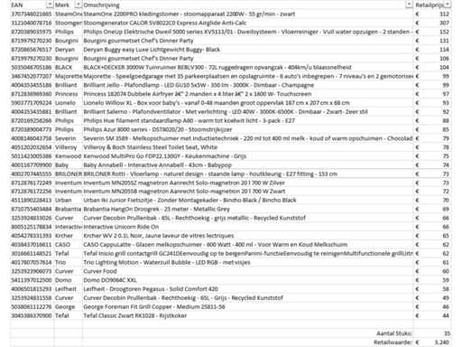 This concerns a batch of A-brand returned goods from a large online retailer. The batch consists of various product categories. Number of pieces: 35. Retail value: €3240,- Unchecked: operation unknown (mix of