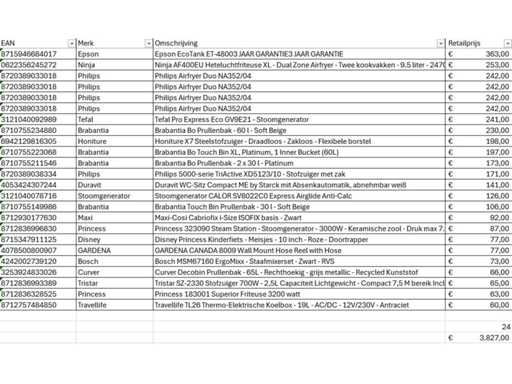 This concerns a batch of A-brand returned goods from a large online retailer. The batch consists of various product categories. Number of pieces: 24. Retail value: €3827,- Unchecked: operation unknown (mix of