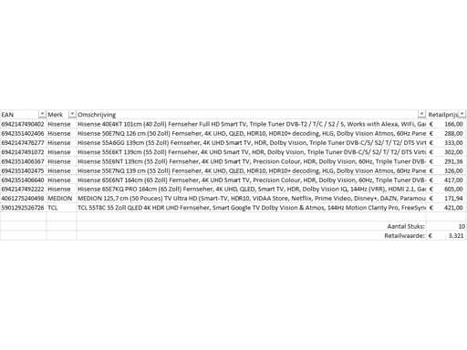 This concerns a batch of televisions returned goods from a large online retailer. The party consists of various sizes of televisions. Number of pieces: 10. Retail value: €3321,- The televisions are not working and can be used for parts. Come on the viewing day to get a good idea of the reason for return. See photos for list of contents.