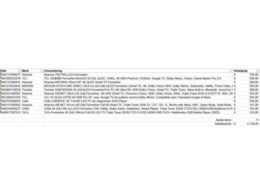 This concerns a batch of televisions returned goods from a large online retailer. The party consists of various sizes of televisions. Number of pieces: 11. Retail value: €4138,- The televisions are not working and can be used for parts. Come on the viewing day to get a good idea of the reason for return. See photos for list of contents.