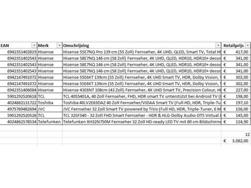 This concerns a batch of televisions returned goods from a large online retailer. The party consists of various sizes of televisions. Number of pieces: 12. Retail value: €3,082 The televisions are not working and can be used for parts. Come on the viewing day to get a good idea of the reason for return. See photos for list of contents.