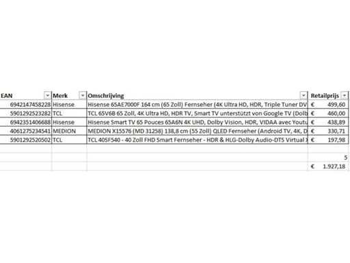 This concerns a batch of televisions returned goods from a large online retailer. The party consists of various sizes of televisions. Number of pieces: 5. Retail value: €1,927 The televisions are not working and can be used for parts. Come on the viewing day to get a good idea of the reason for return. See photos for list of contents.