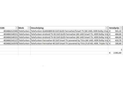 This concerns a batch of televisions returned goods from a large online retailer. The party consists of various sizes of televisions. Number of pieces: 5. Retail value: €2,061 The televisions are not working and can be used for parts. Come on the viewing day to get a good idea of the reason for return. See photos for list of contents.