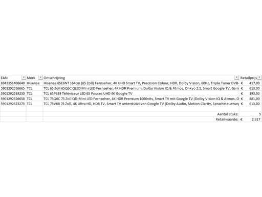 This concerns a batch of televisions returned goods from a large online retailer. The party consists of various sizes of televisions. Number of pieces: 5. Retail value: €2917,- The televisions are not working and can be used for parts. Come on the viewing day to get a good idea of the reason for return. See photos for list of contents.