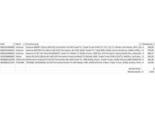 This concerns a batch of televisions returned goods from a large online retailer. The party consists of various sizes of televisions. Number of pieces: 6. Retail value: €2019,- The televisions are not working and can be used for parts. Come on the viewing day to get a good idea of the reason for return. See photos for list of contents.