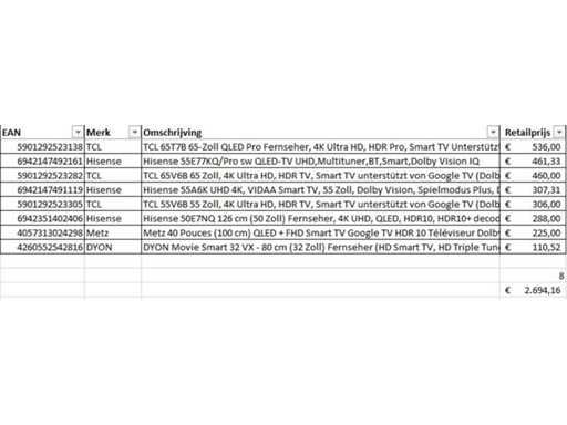 This concerns a batch of televisions returned goods from a large online retailer. The party consists of various sizes of televisions. Number of pieces: 8. Retail value: €2,694 The televisions are not working and can be used for parts. Come on the viewing day to get a good idea of the reason for return. See photos for list of contents.